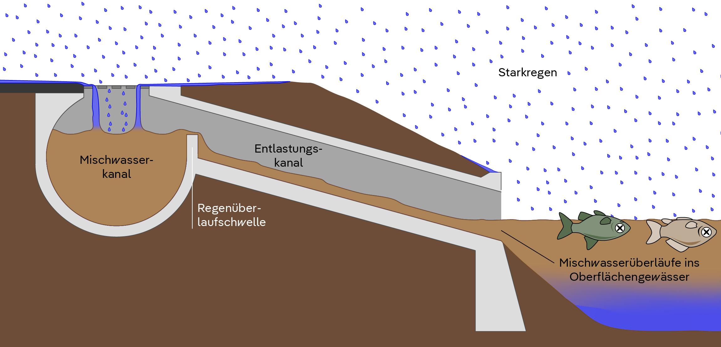 Seit 150 Jahren sorgt die Mischwasserkanalisation für hygienische Standards in Städten und schützt Grundstücke und Gebäude vor Überschwemmungen. Leider kann die Kanalisation bei starken Regenfällen an ihre Kapazitätsgrenzen stoßen und Mischwasserüberläufe ins Oberflächenwasser verursachen, was die Gewässerqualität stark beeinträchtigt. Die Folgen: Fischsterben und massenhaftes Algenwachstum.