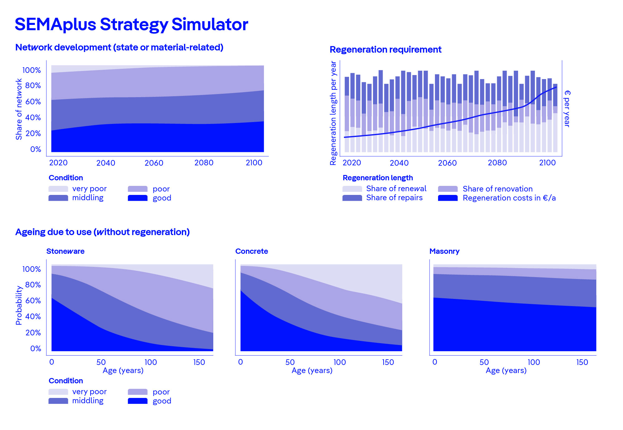 SEMAplus provides rapid and accurate information as well as a foundation for targeted short-term maintenance and long-term investment planning. To accomplish this, SEMAplus requires only a limited amount of inspection and sewer data (age, material, diameter, etc.) and, if available, data on other ageing-relevant sewer properties and environmental factors. This saves you resources, costs and time. SEMAplus also simplifies communication between decision-makers thanks to its easily understandable interactive dashboards.