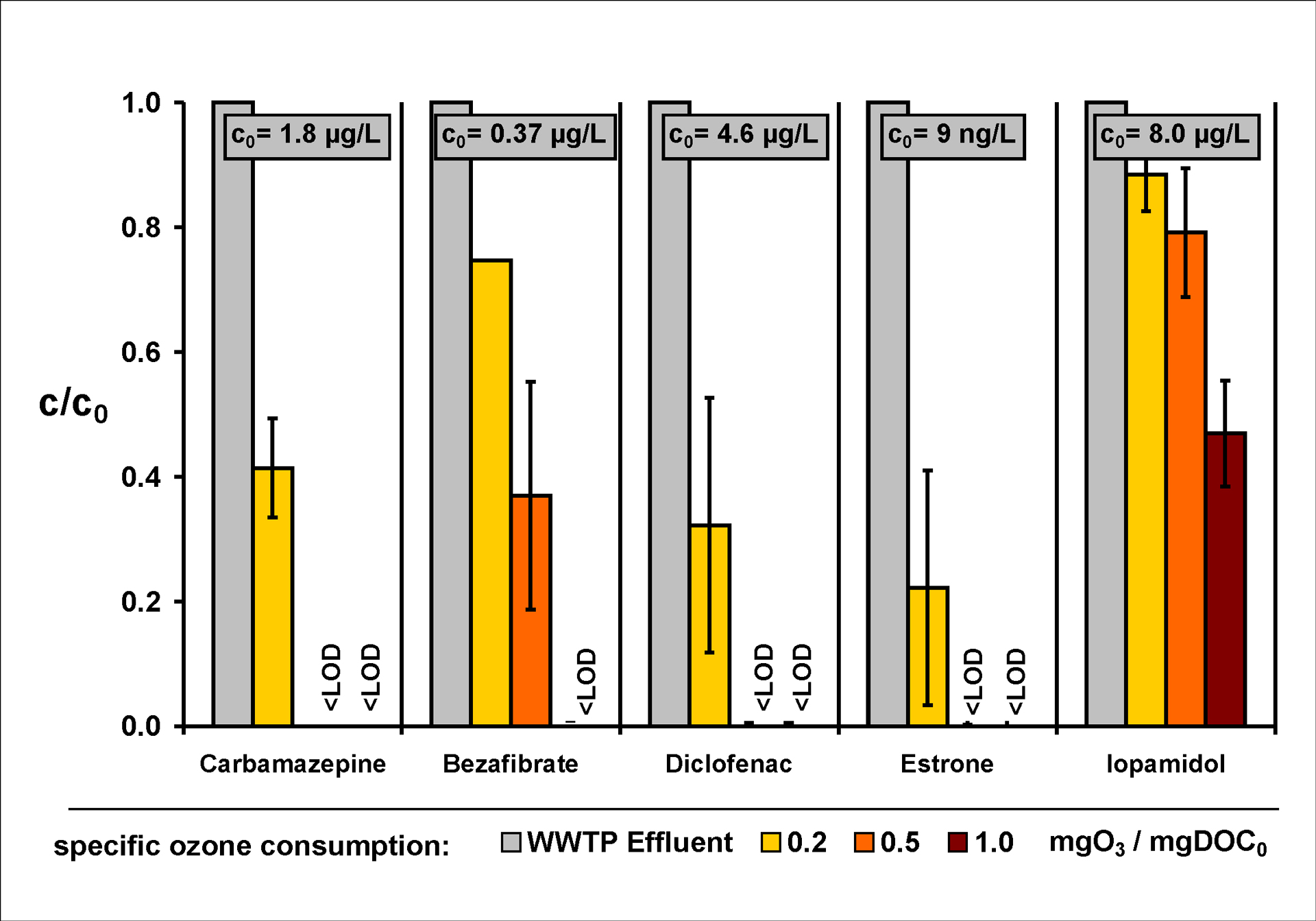 The neutral pharmaceuticals (the analgetica phenazone and propyphenazone as well as the enti-epilepticum carbamazepin) and several other acid pharmaceuticals (naproxene, diclofenac) have been removed at a low ozone dosage of 5 mg/LO3 to below their analytic detection limit. On the other hand, the lipid-lowering agents bezafibrate and clofibric acids have been removed at a slightly higher ozone dosage. The steroid hormones ethinylestradiol and estradiol have proven to be very sensitive to the ozone process and have been oxidated at very low O3 concentrations. The X-ray contrast media however, have turned out to be more resistant: even at a high ozone dosage, their concentrations have been reduced to some extent only. In this context, it has been detected that through the combination of H2O2 and ozone, an elevated elimination rate for the substances iopamidol and iohexol can be achieved.